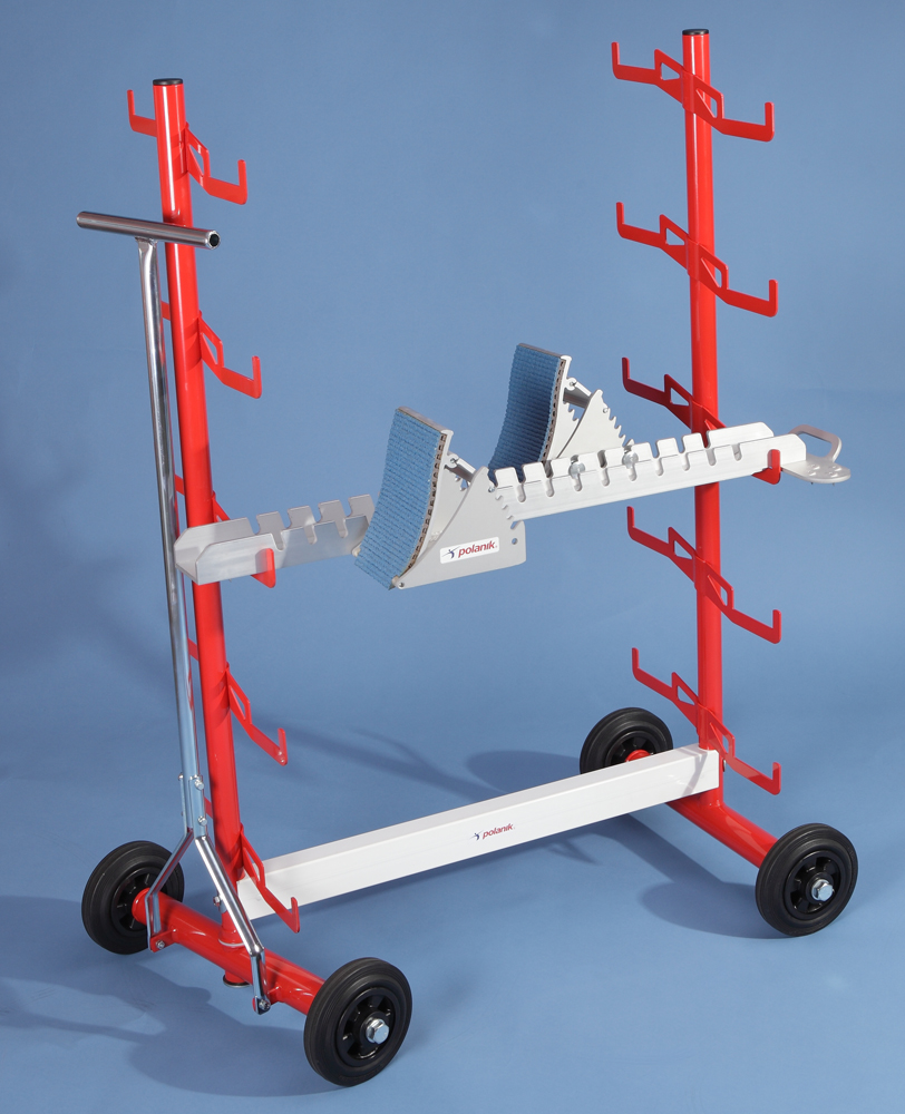 Startblokkvogn Polanik for 10 blokker En pen liten startblokkvogn fra Polanikk. Kapasitet 10 startblokker. Pulverlakkerte stålrør og profiler.