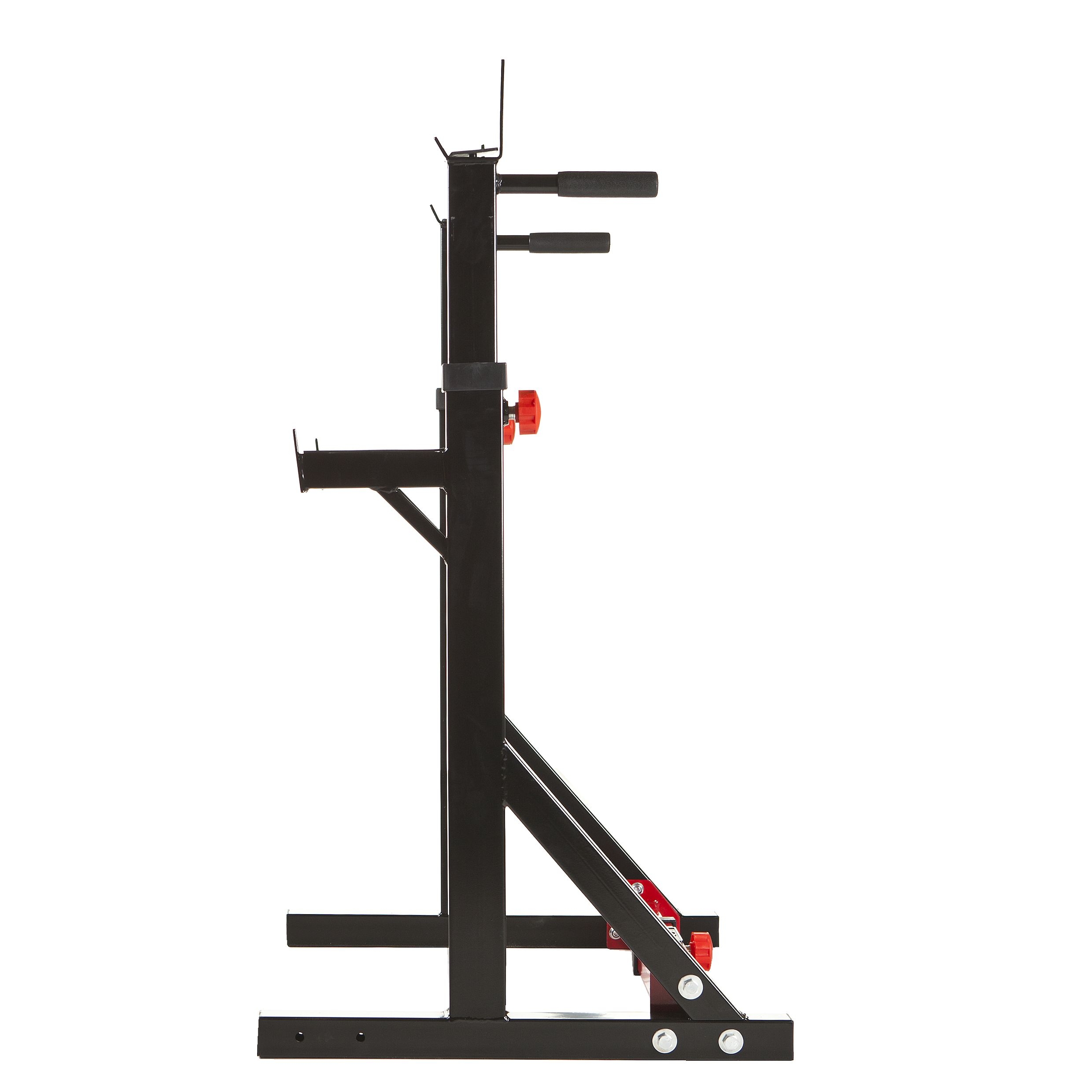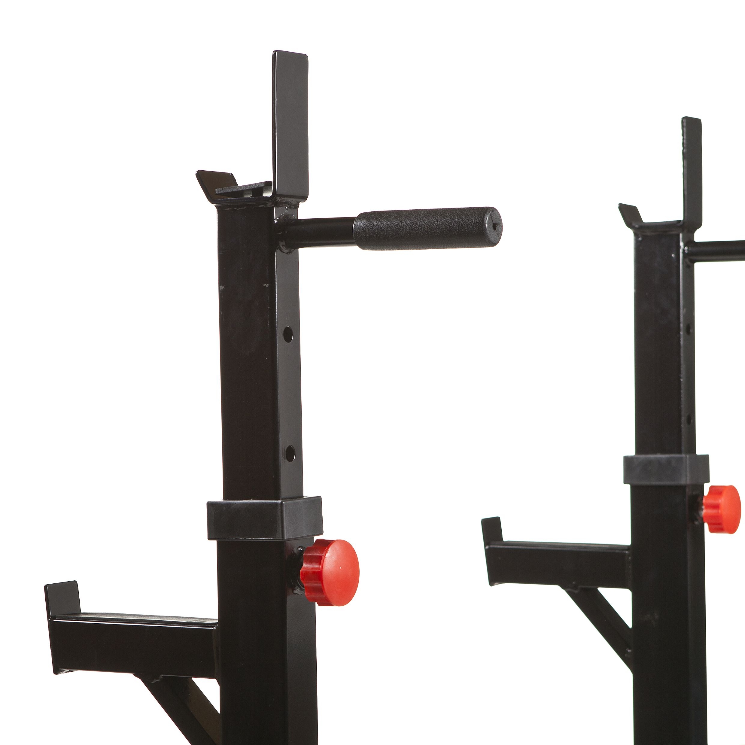 Et stabilt knebøy-/dipsstativ med justerbar høyde og bredde som enkelt kan brukes til forskjellige vektstenger og øvelser. Stativet er robust og har en høykvalitets finish som tåler riktig bruk. Med sitt praktiske design er det mulig å utføre en rekke øvelser som knebøy, benkpress, dips, L-sits og skulderpress. Så perfekt for hjemmegymmet, da du kan få en god fullkroppsøkt med hjelp av dette stativet.